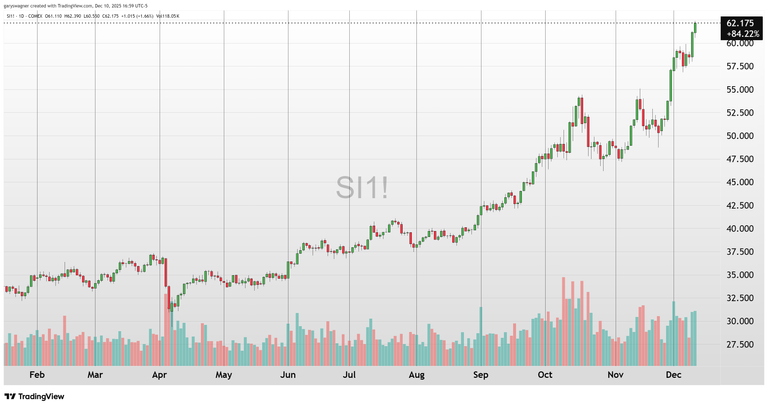 Silver demonstrated similar strength after establishing a new record earlier in the session. Following brief pre-announcement pressure, the white metal gained $1.35 in the post-decision rally, pushing above $62 to set another record high. Silver futures last traded at $62.20, up $1.03 or 1.67%.