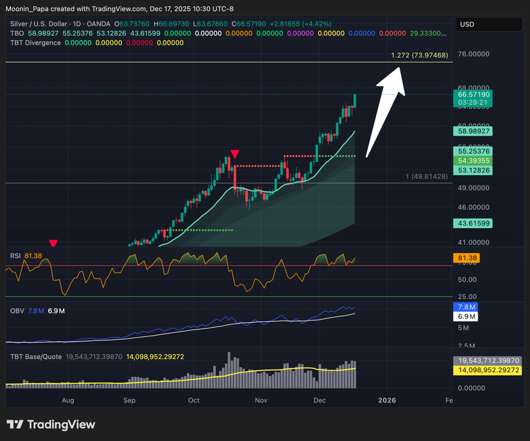 Gold is advancing toward the TBO Resistance zone at $4,375 as equity markets struggle. Silver posted a new all-time high at $66 and is targeting $74, corresponding to the 1.272 Fibonacci extension. Platinum is also exhibiting strength, benefiting from the broader risk-off environment.