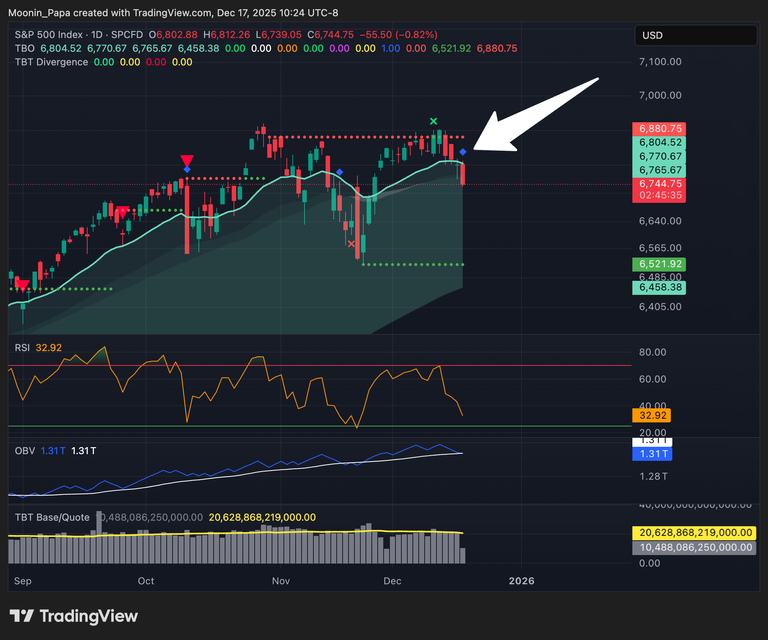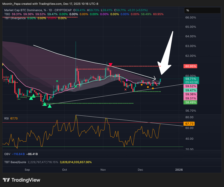 Combined stablecoin dominance has rallied back to the TBO Resistance level, yet the daily RSI has not surpassed its prior local high of 71.64, indicating limited momentum. Meanwhile, Bitcoin dominance (BTC.D) has risen above the daily TBO Cloud, signaling that altcoins are under pressure, as reflected by OTHERS.D trading down 1.64% on the day.