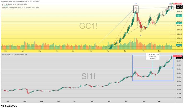 Gold futures achieved a significant milestone, surging through the previous record high of approximately $4,400 established on October 20th. The yellow metal climbed $110.50, or 2.53%, to settle at $4,478.40, marking a decisive break into uncharted territory. This rally extended across the entire precious metals complex, with silver joining gold in record-breaking fashion by advancing $1.59, or 2.36%, to reach an all-time high of $68.98. The white metal's strength was complemented by substantial gains in the platinum group metals, where platinum surged 6.25% and palladium posted a 3.92% advance.