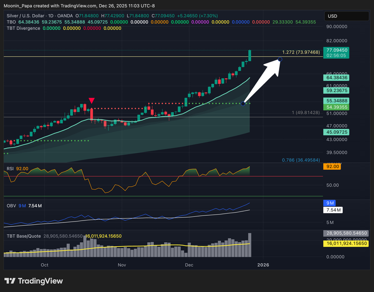 Precious metals continue to outperform expectations. Gold’s daily RSI hit 93.12, pointing toward a target near $4,781. Silver cleared the $74 1.272 Fibonacci extension, and platinum surged 8% intraday. Conversely, copper (XCUUSD) is forming a three‐bar TBO breakout cluster high above prior highs—often an exhaustion signal—so traders should monitor for a potential top.