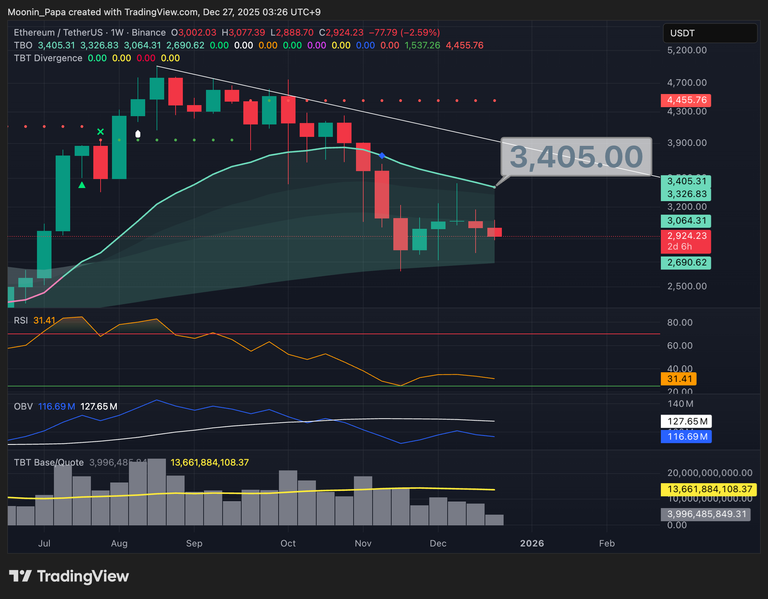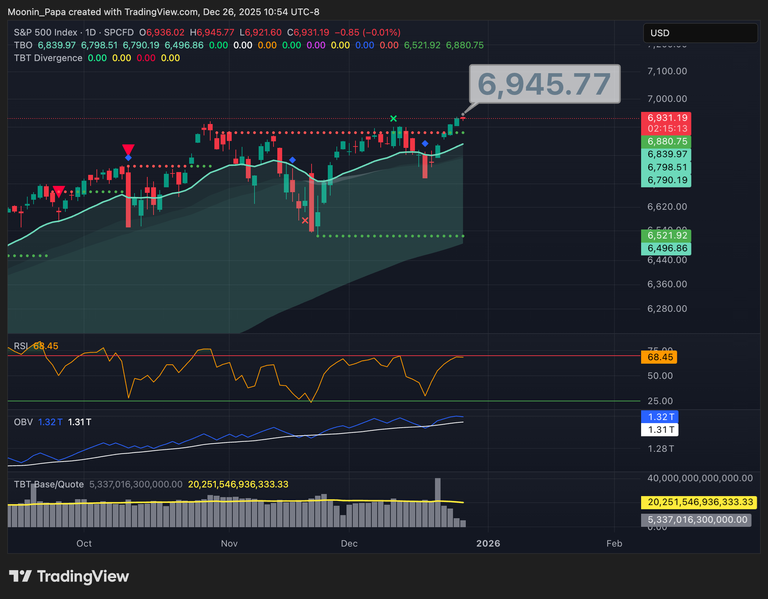 Bitcoin remains below the daily TBO Cloud in a strong bearish configuration, with the fast line frequently tagged by upper wicks this week and the slow line continuing downward. On‐Balance Volume’s moving average has flattened, suggesting the market may be primed for a volume‐driven green candle once holiday trading resumes. On the weekly chart, a TBO Open Short is in progress—confirmation of this would complete the TBO Bear Formula and cement the bear market thesis.