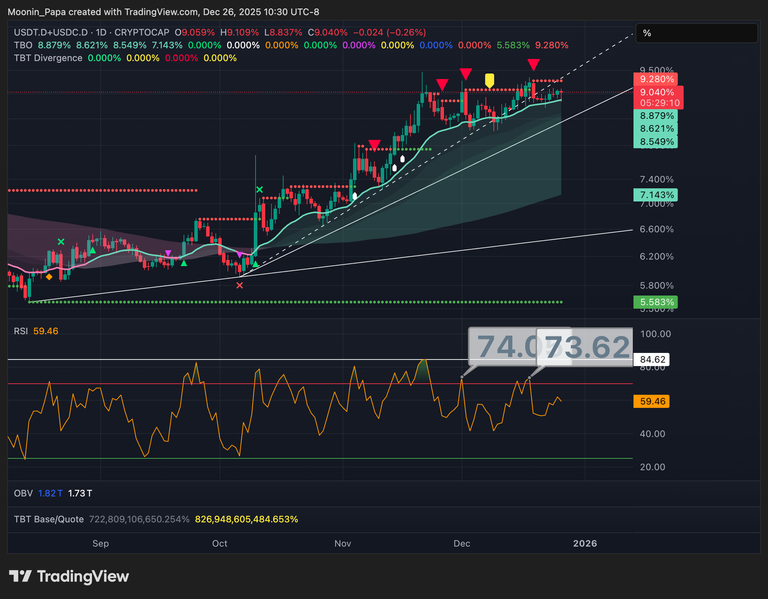 Combined stablecoin dominance remains in a strong bullish phase but displays several wicks into the fast line and a failed RSI high, signaling mounting weakness. A decisive break above $91,000 in Bitcoin price would likely drag stablecoin dominance back into the daily cloud, serving as the first domino in a broader market reversal.