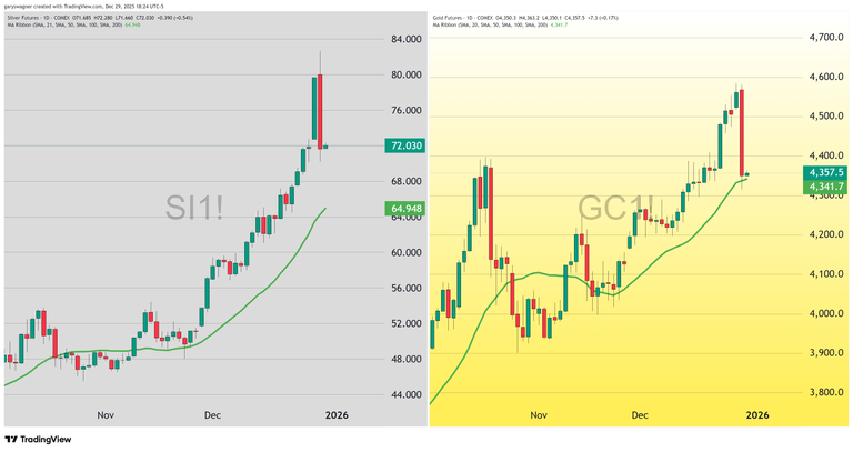 Gold and silver experienced significant sell-offs this week, retreating from record highs as investors took profits following the precious metals' strongest annual performance in decades. Gold, which peaked at $4,550 on Friday—representing a gain of more than 70% year-to-date—closed the session with a more modest 65% annual gain. The sell-off today, drove prices down approximately $200, or 4.43%, to settle at $4,332. Market analysts attribute the decline primarily to profit-taking after gold posted its best yearly performance since 1979.