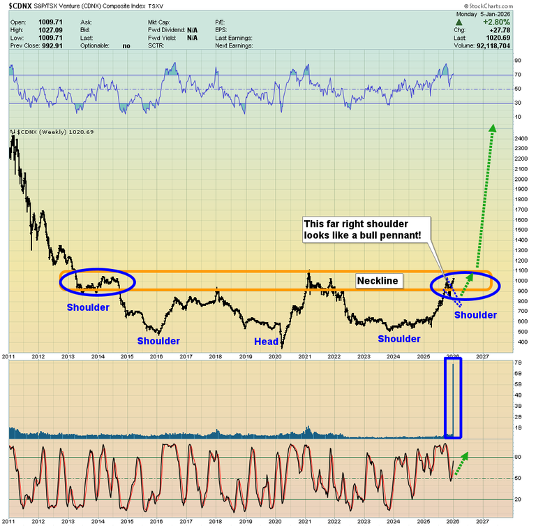 21. The miners? Click to enlarge what may be… the world’s most bullish chart. I’ve urged mine stock investors to keep an eye on the CDNX as an indicator for the potential upside for all types of gold and silver mining stocks. The right shoulder could be a bull wedge that is set to launch a glorious breakout for outrageously undervalued miners.