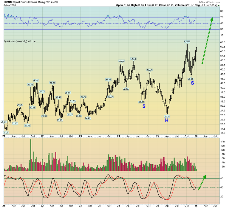 19. Another tool of significance for gold-oriented investors is uranium. To view a stunning yellowcake stocks chart (URNM ETF). Double-click to large. An inverse H&S bull continuation pattern is in play, and it features a very bullish high right shoulder.