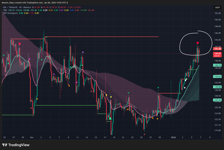 XRP closed with a pronounced doji and rising volume, suggesting a short-term tug-of-war ahead of a potential pullback. SOL and several other altcoins printed four-hour TBT Bearish Divergences near historical resistance, indicating possible pivot highs. Despite this, a premature push to short may be ill-timed—many charts could see one more leg higher before a deeper correction.