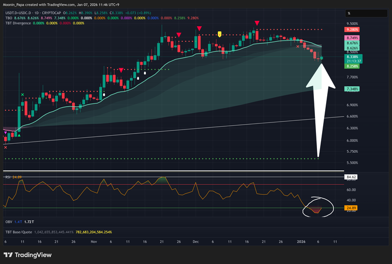 Combined stablecoin dominance on the daily chart is tracking a rising TBO Support from roughly 5.5 percent toward 8.25 percent, while its RSI bottomed at 14.96. A green daily close would produce an RSI Reset—often a bullish inflection. Conversely, Bitcoin dominance (BTC.D) slipped below its daily Cloud and is headed for 58.49 percent, with an oversold RSI under 25 hinting at a similar reset.