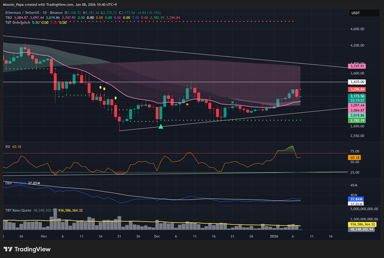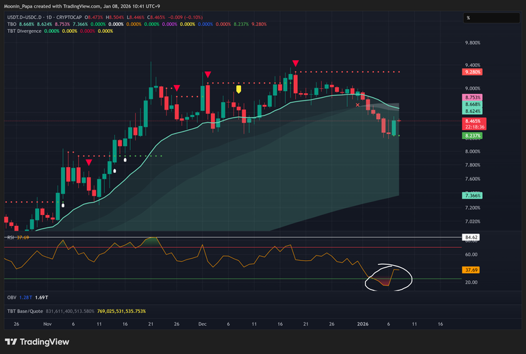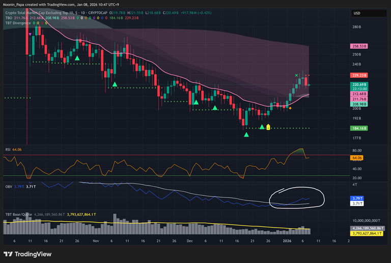The OTHERS market cap index is testing its daily TBO Cloud ceiling. Traders should monitor volume rising above its moving average and OBV curling upward to confirm a breakout. The OTHERS/BTC pair activated a TBO Open Long earlier this week, with resistance pivoting from 0.15 down to 0.12. Sustained strength here would confirm altcoins outperforming Bitcoin.