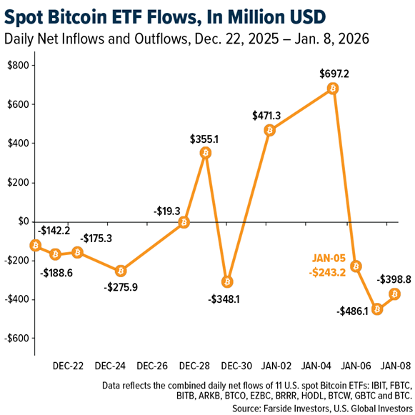 - U.S. spot Bitcoin ETFs reaffirmed their role as the primary institutional access point to crypto, attracting $697 million in inflows on the second trading day of 2026 and more than $1.1 billion in total inflows across the first two days of the year, according to Farside Investors. Despite significant outflows in late 2025, ETF assets remain above $110 billion, highlighting durable institutional participation and positioning ETFs as a structural, long-term allocation channel rather than short-term speculative capital.