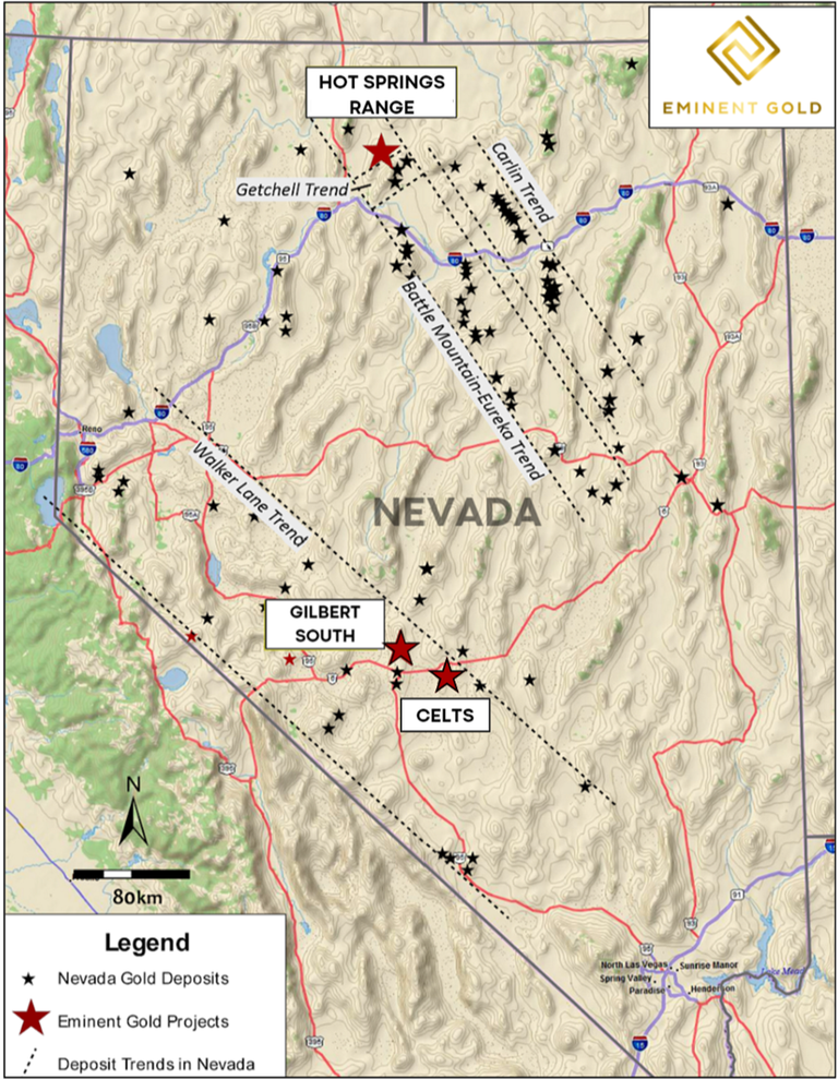 Location map of Eminent Gold’s portfolio of gold exploration projects in Nevada: Hot Springs Range, Celts, and Gilbert South.